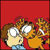 Description: Garfield the cat is all up in Jon Arbuckle's face waving his arms.